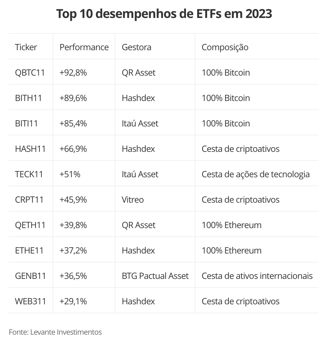 Eight of the ten best-performing ETFs trading on Brazil’s B3 Exchange so far in 2023 are comprised of crypto assets, according to an analysis by Levante Investimentos.