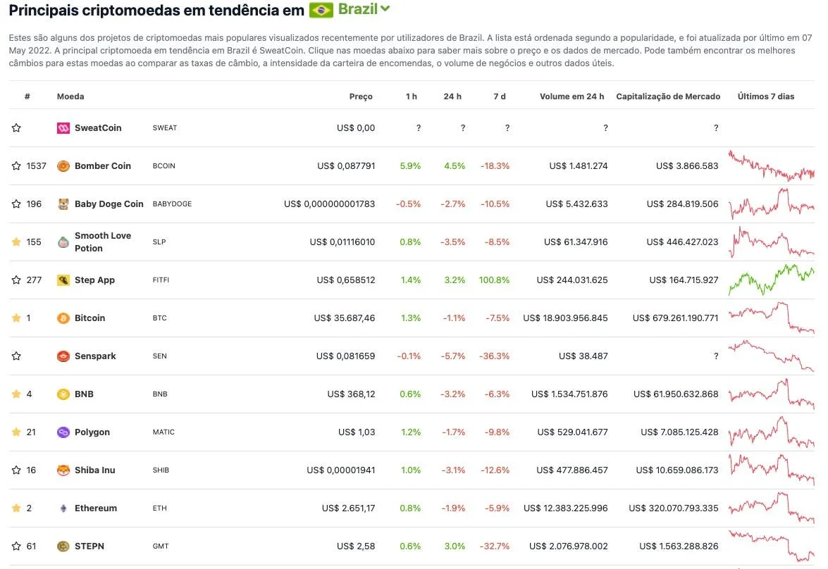 Here’s a weekly snapshot of trending cryptocurrencies in Brazil as of May 7, 2022, per data provider CoinGecko. “Move to Earn” tokens like Stepn and Sweatcoin are surging in interest. CoinTelegraph Brasil reports that the Sweatcoin app was the most downloaded application in Brazil in both the Apple Store and Google Play app stores last week.