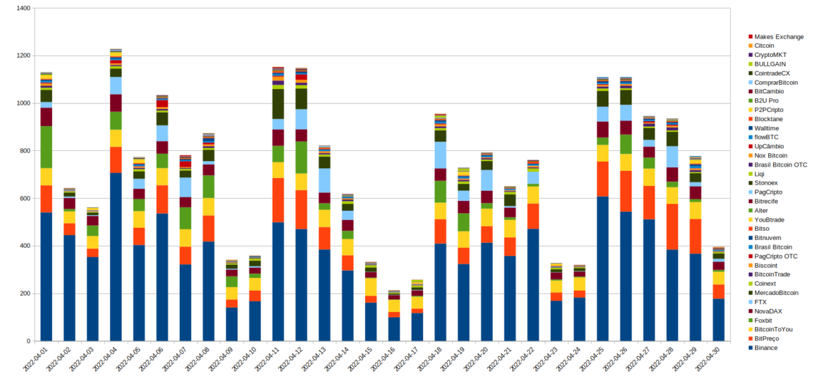 Brazilians exchanges moved 22,080 bitcoins for the month of April, worth R$4.4bn (US$866m), according to a report from CoinTrader Monitor.
